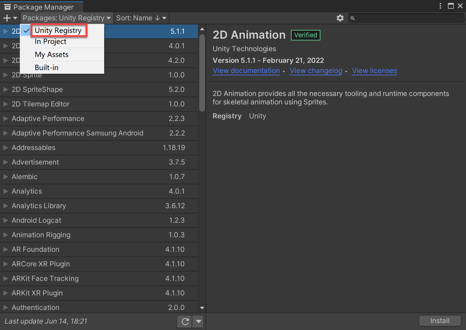 在 Package Manager 窗口中,点击 Packages > Unity Registry。