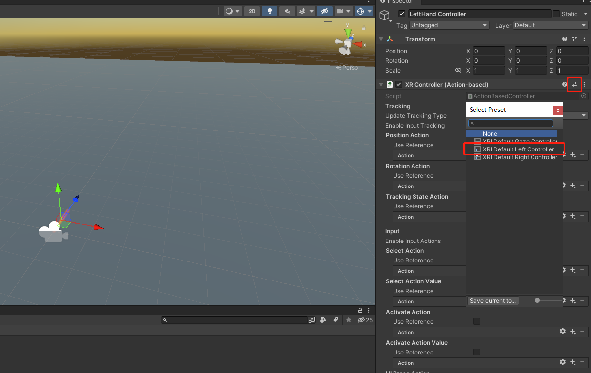 在 Inspector 窗口中,点击 XR Controller (Action-Based) 面板右上角的 预设 图标,你将看到Select Preset窗口。双击添加 XRI Default Left Controller设置文件,导入默认左手柄设置。