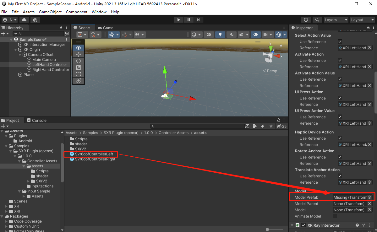 在 Project 窗口中,前往 Assets > Samples > SXR Plugin (openxr) > 1.0.0 > Controller Assets > assets,将Svr6dofControllerLeft拖至Model Prefab中。
