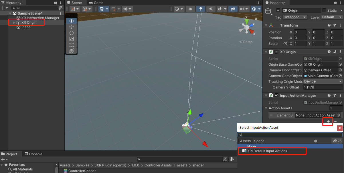 点击 + > XR > XR Origin(Action-based),将 XR Origin 添加至场景。