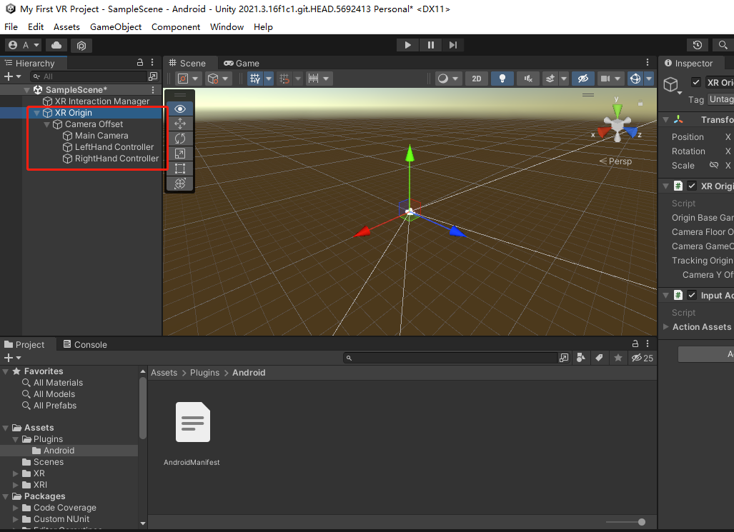 Inspector 窗口中将显示 XR Origin 挂载的组件和脚本。