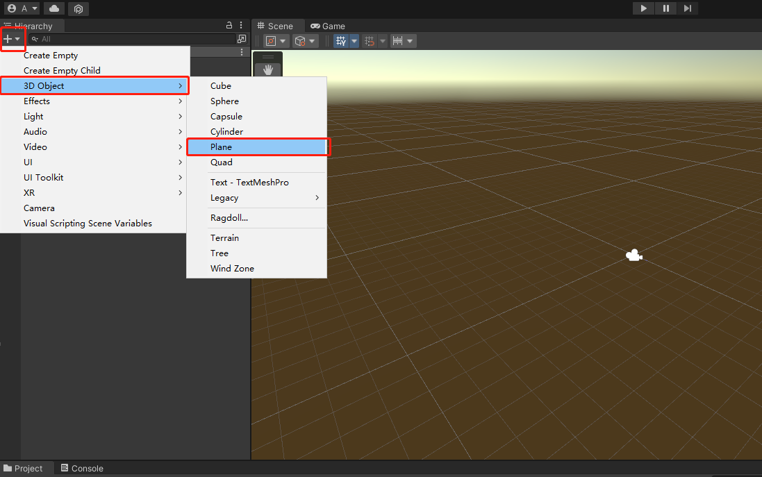 在 Hierarchy 窗口中,点击 + > 3D Object > Plane。