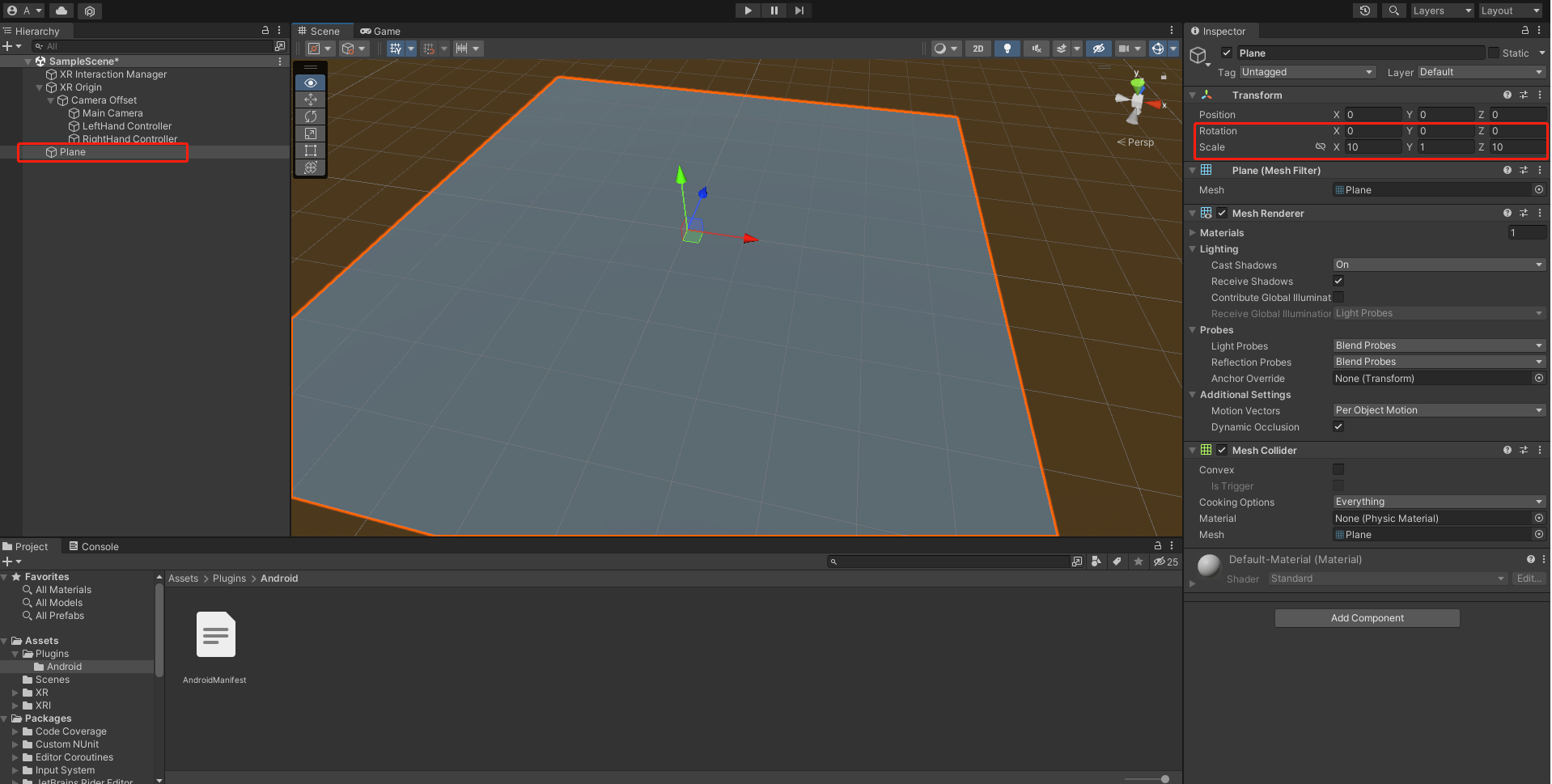 一个白色默认平面被添加至场景。选中 Plane,Inspector 窗口中将显示 Plane 物体的属性。