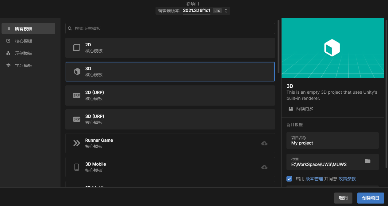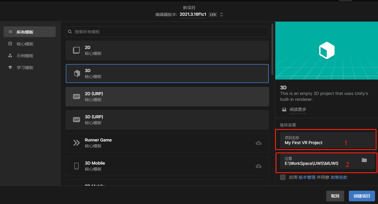 导入 SDK 前,需要在 Unity Hub 中新建项目。步骤如下: