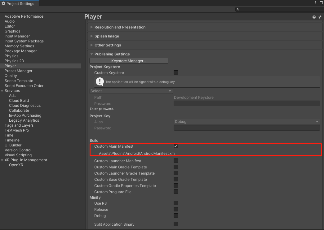 如果想自定义安卓清单文件,可以前往 Edit > Project Settings > Player > Publishing Settings > Build,然后勾选 Custom Main Manifest。勾选后,将在 Assets/Plugins/Android 路径下生成 AndroidManifest.xml 文件。你可以打开文件并添加自定义配置。