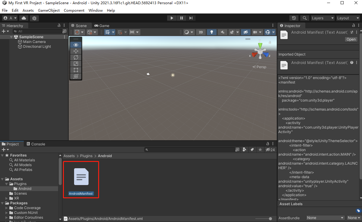 由于PANCAKE VR设备基于安卓系统,所以任何运行在设备上的应用都必须包含安卓清单文件(AndroidManifest.xml)。该文件包含安卓应用的重要元信息,包括配置信息、权限、软硬件支持、安卓版本支持等。若使用 Unity 引擎来生成 PANCAKE VR 应用,APK 文件内会自动生成安卓清单文件。基于你的应用配置,安卓清单文件内会自动生成相应的配置内容。例如,当你在 Unity 编辑器中为应用配置Internet Access能力后,相应的配置元数据将被自动添加至安卓清单文件。因此,你无需手动为文件添加任何内容,直接编译和运行即可。