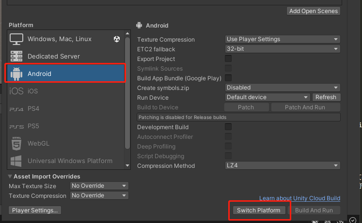 从上方菜单栏处,选择 File > Build Setting,在Build Setting界面,将项目切换到Android平台下。