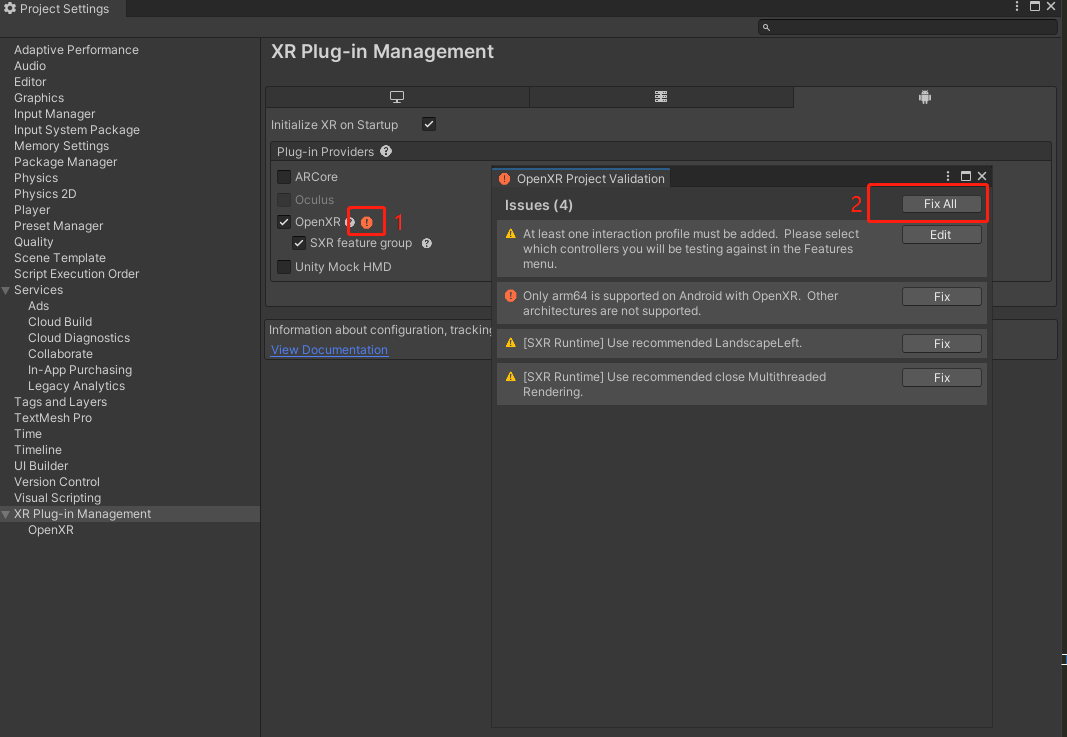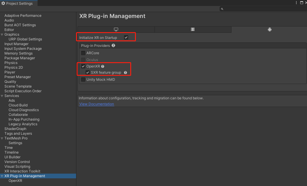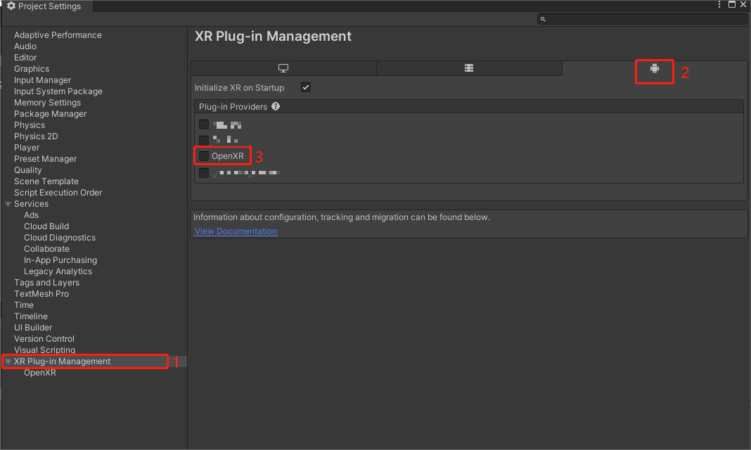 在 Project Settings 窗口中,点击 XR Plug-in Management > 安卓设置图标,勾选OpenXR。