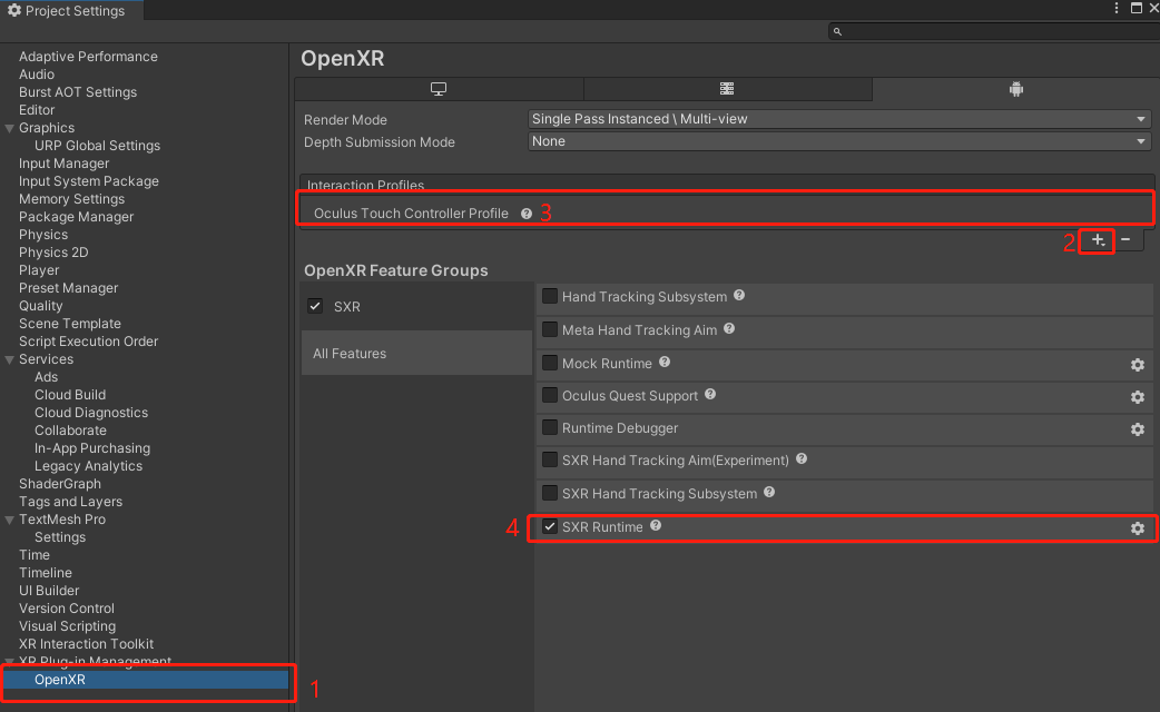 按步骤添加Oculus Touch Controller Profile 及勾选 SXR Runtime。