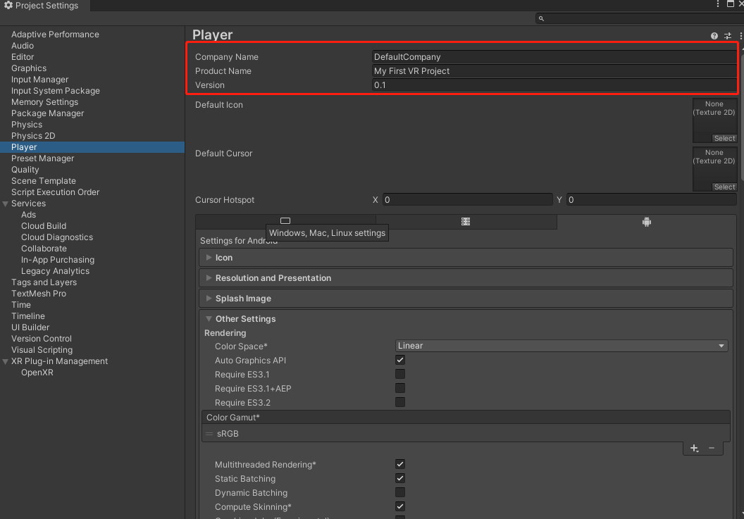b.在 Player 面板处,设置 Company Name、Product Name 和 Version。