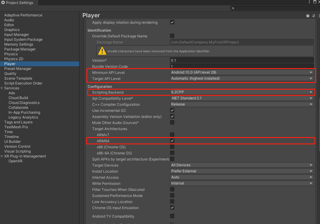 · Minimum API Level:设置应用运行所需的最低 Android SDK 版本。PANCAKE Unity SDK插件支持的最低 Android SDK 版本为 10.0(即 API 等级 29)。若低于该版本,构建应用时可能会报错。