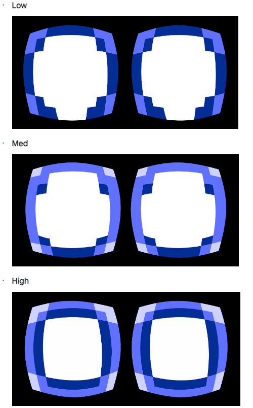 PANCAKE Unity SDK 提供三个注视点渲染等级:FOVEATION_LEVEL_LOW、FOVEATION_LEVEL_MEDIUM、FOVEATION_LEVEL_HIGH。不同等级对分辨率的影响不同。示意图如下: