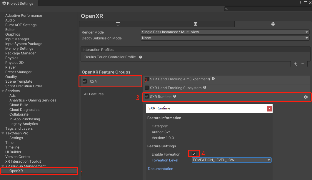 - 点击 SXR Runtime 将弹出 Feature Settings 面板。