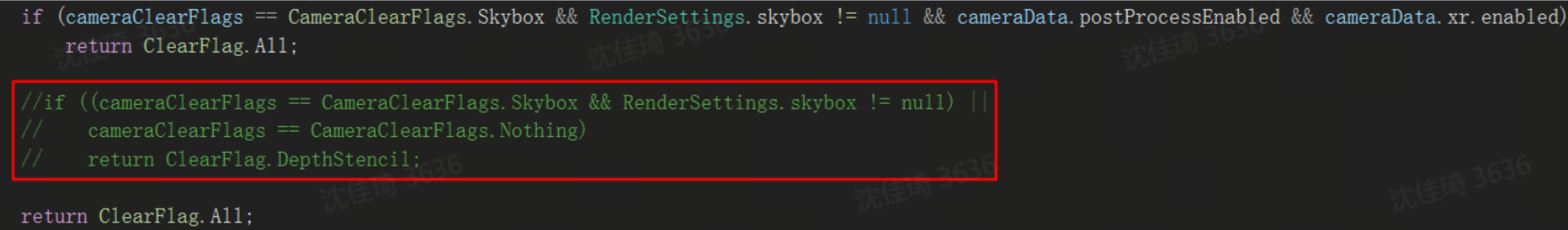 解决方法:在 ScriptableRenderer 的 GetCameraClearFlag 方法中注释掉 CameraClearFlags.Skybox 部分,使其也返回 ClearFlag.All,如下图所示。