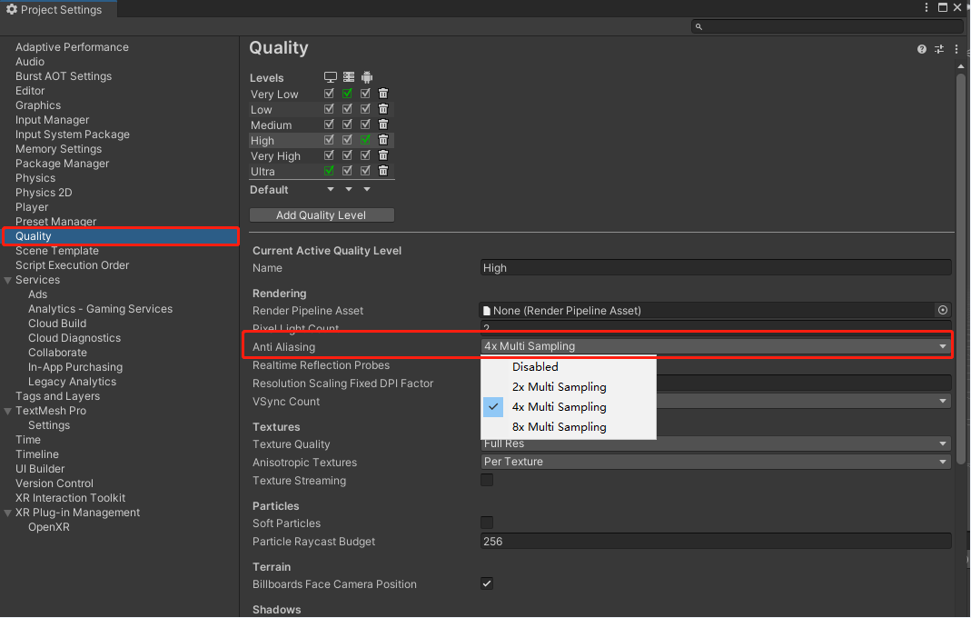 Unity 提供的默认抗锯齿倍数为 “2、4、8 倍 MSAA”。建议使用4倍 MSAA抗锯齿倍数,这样能在性能开销不是很大的情况下获得比较清晰的视觉效果。